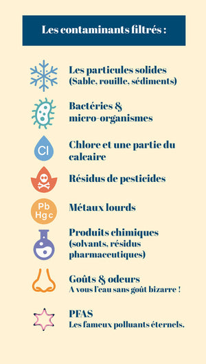 Ces deux technologies de filtration combinées s'attaquent à des types spécifiques de polluants, offrant une solution complète et efficace pour améliorer l’eau que vous consommez au quotidien. Voici une explication approfondie de notre système :